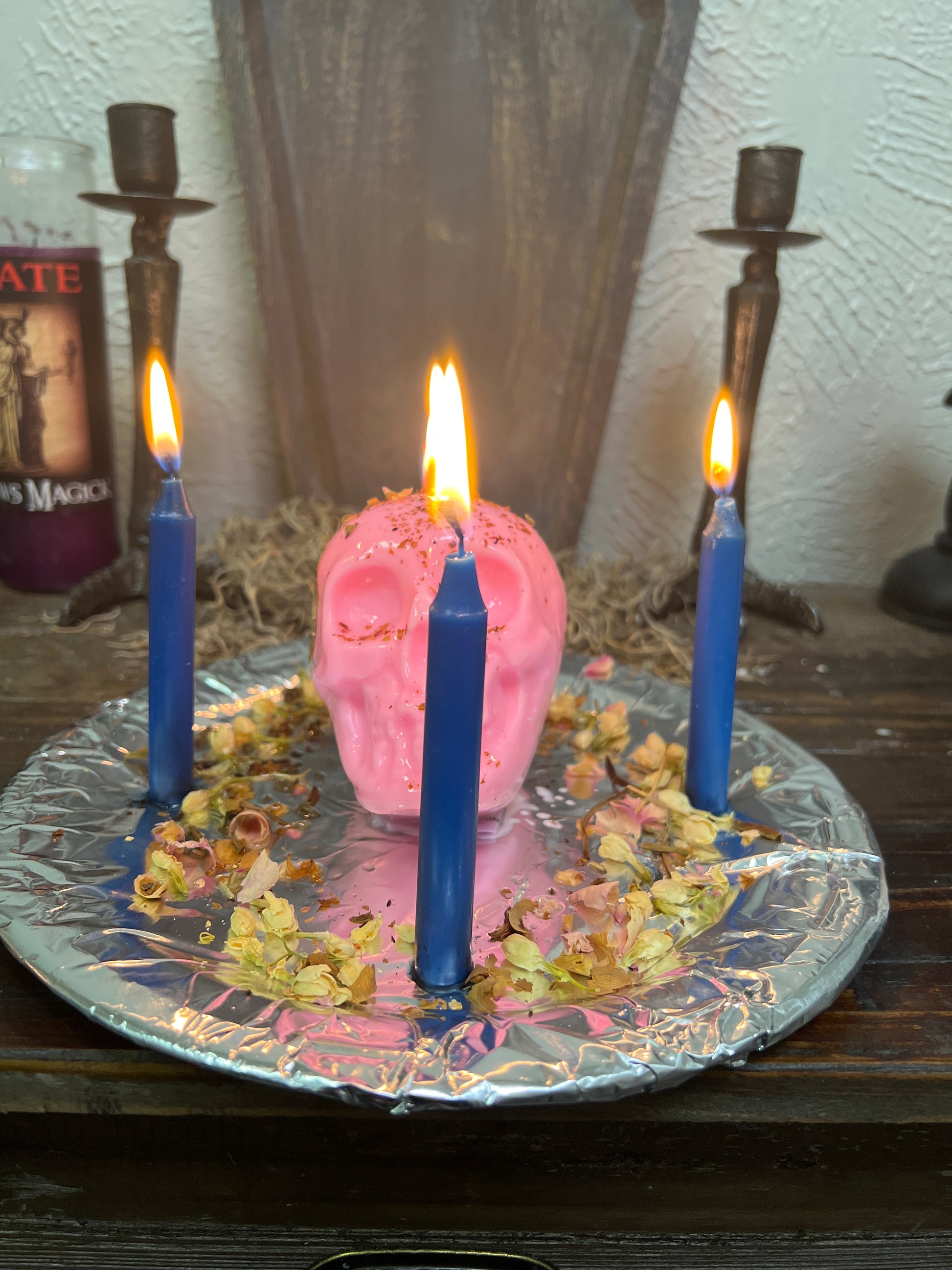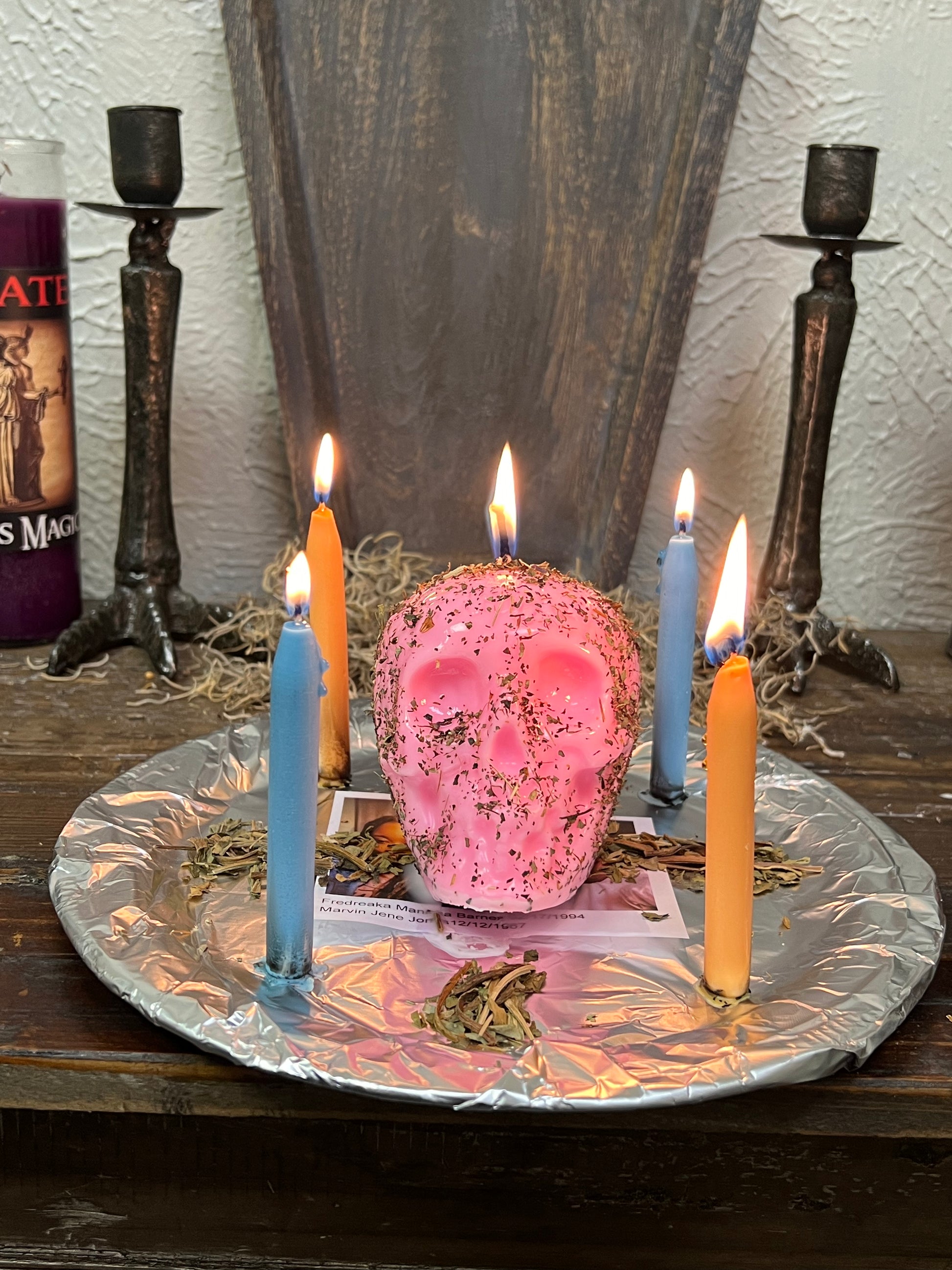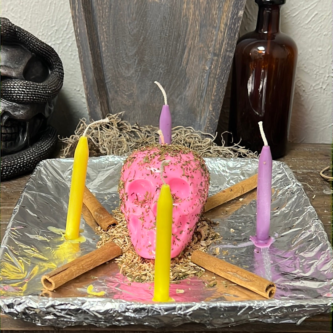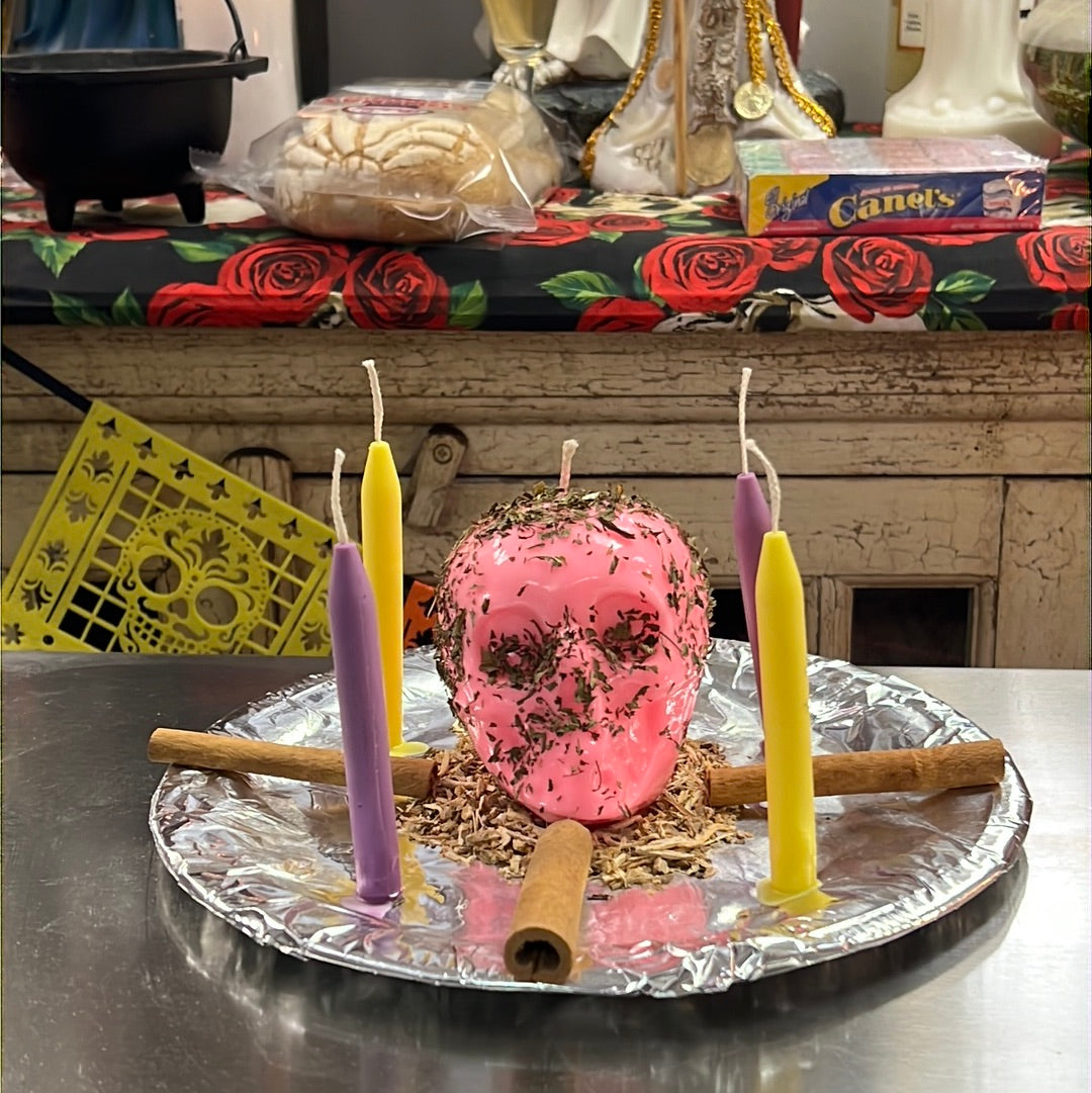 We will bless a red or pink skull candle, dress it with the appropriate conjure oils and herbs, and dress and bless additional taper candles. Candles are custom-made to order.