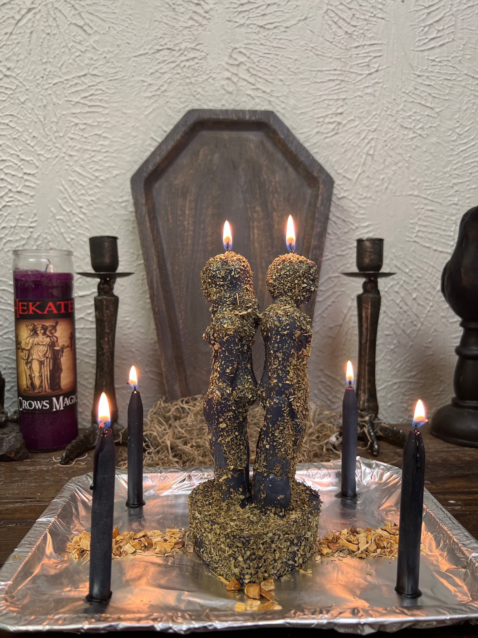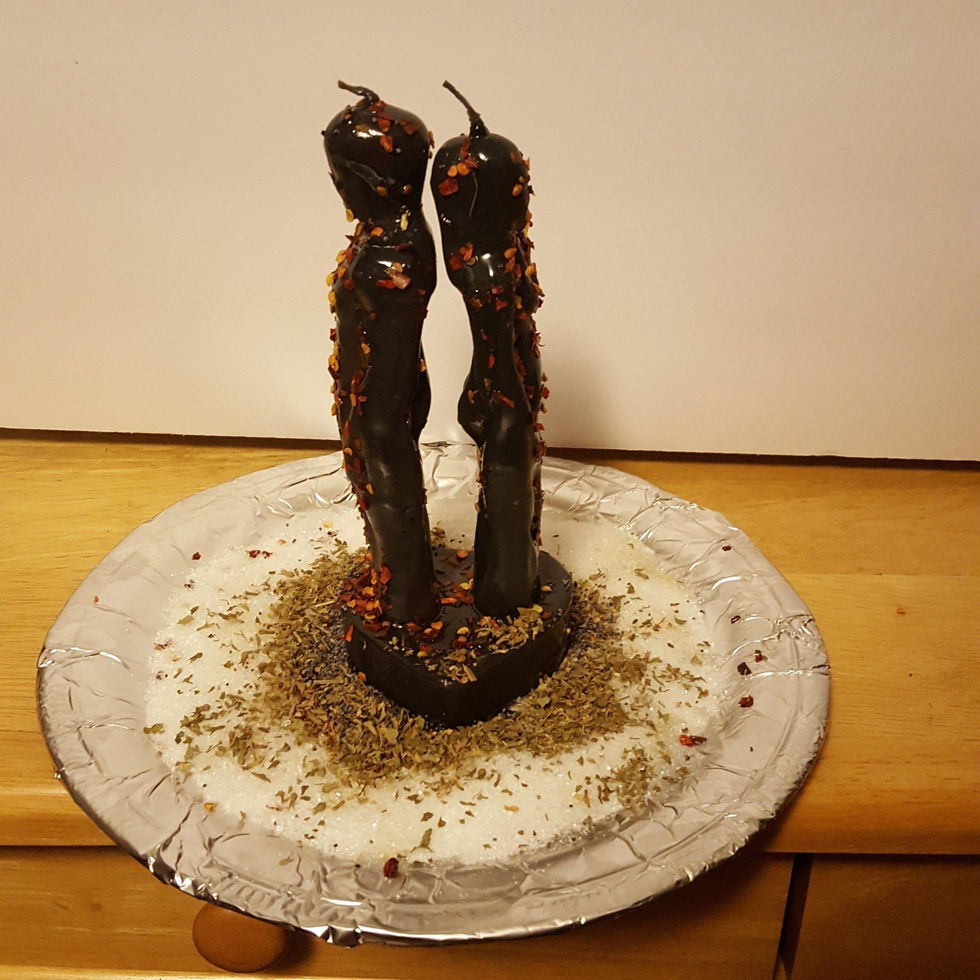 We will bless black figural candles, dress them with the appropriate oils and herbs, and dress and bless additional taper candles.