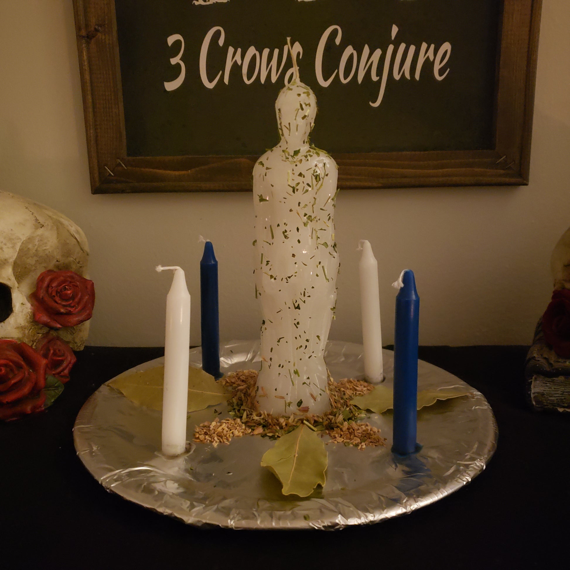 We will bless a figural candle, dress it with the appropriate oils and herbs, and dress and bless additional taper candles.