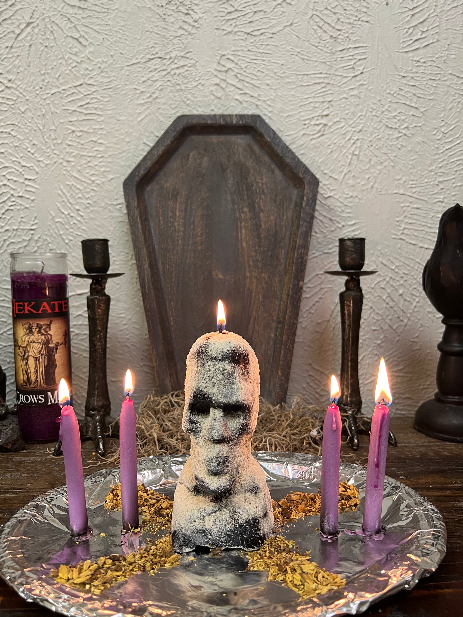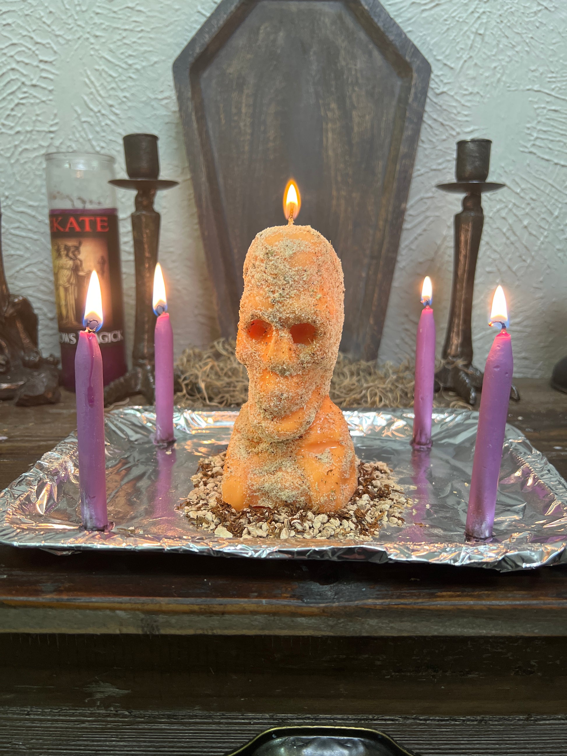 We will bless a skull candle, dress it with the appropriate oils and herbs, and dress and bless additional taper candles. Each candle is custom made to order.