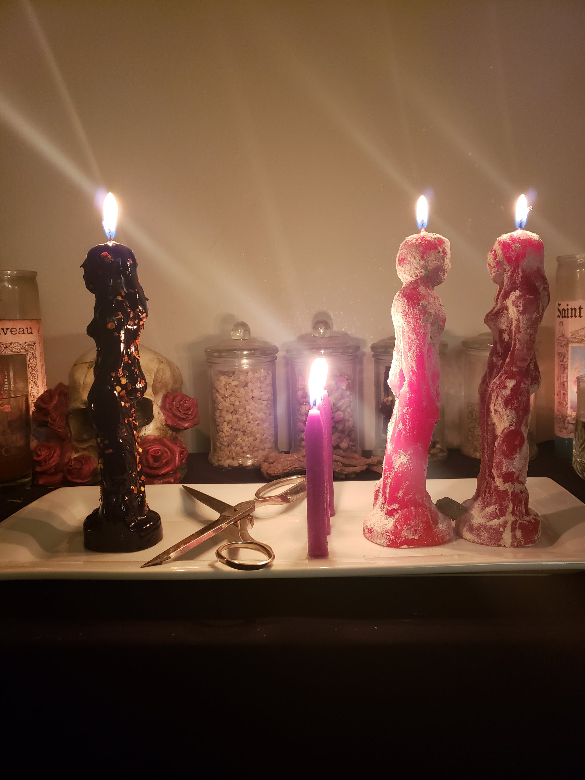 We will bless a black male or female candle, dress it with the appropriate oils and herbs, and dress and bless additional taper candles.