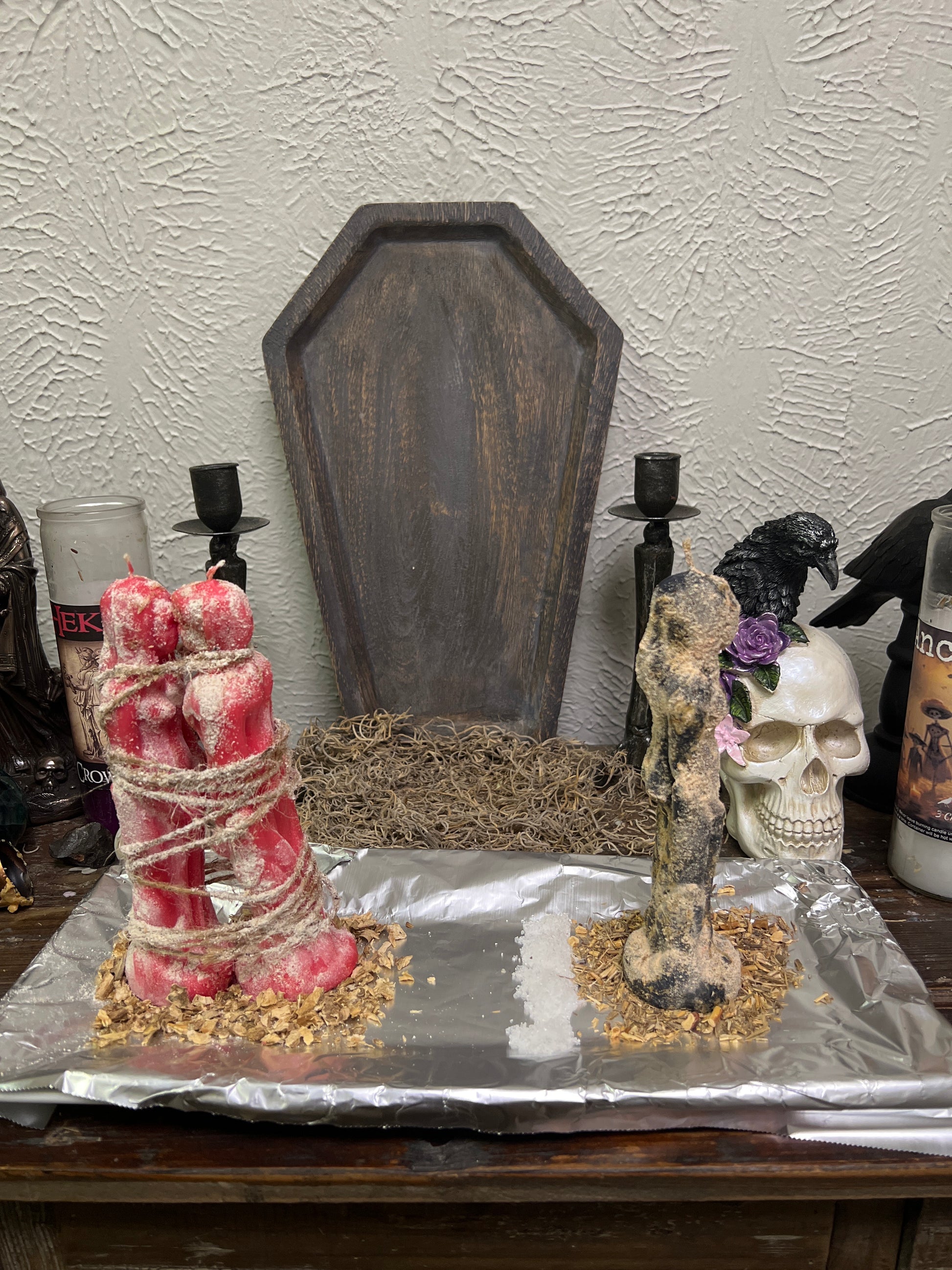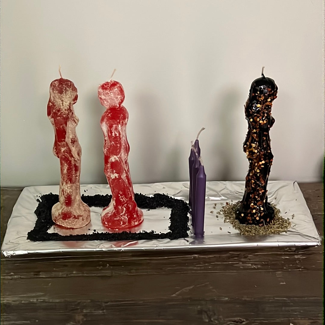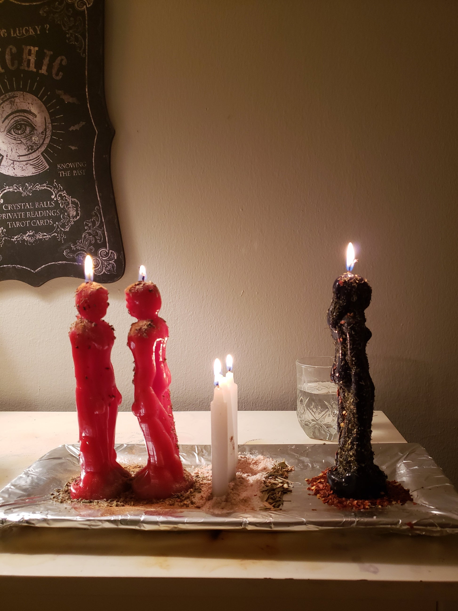 We will bless a black male or female candle, dress it with the appropriate oils and herbs, and dress and bless additional taper candles.