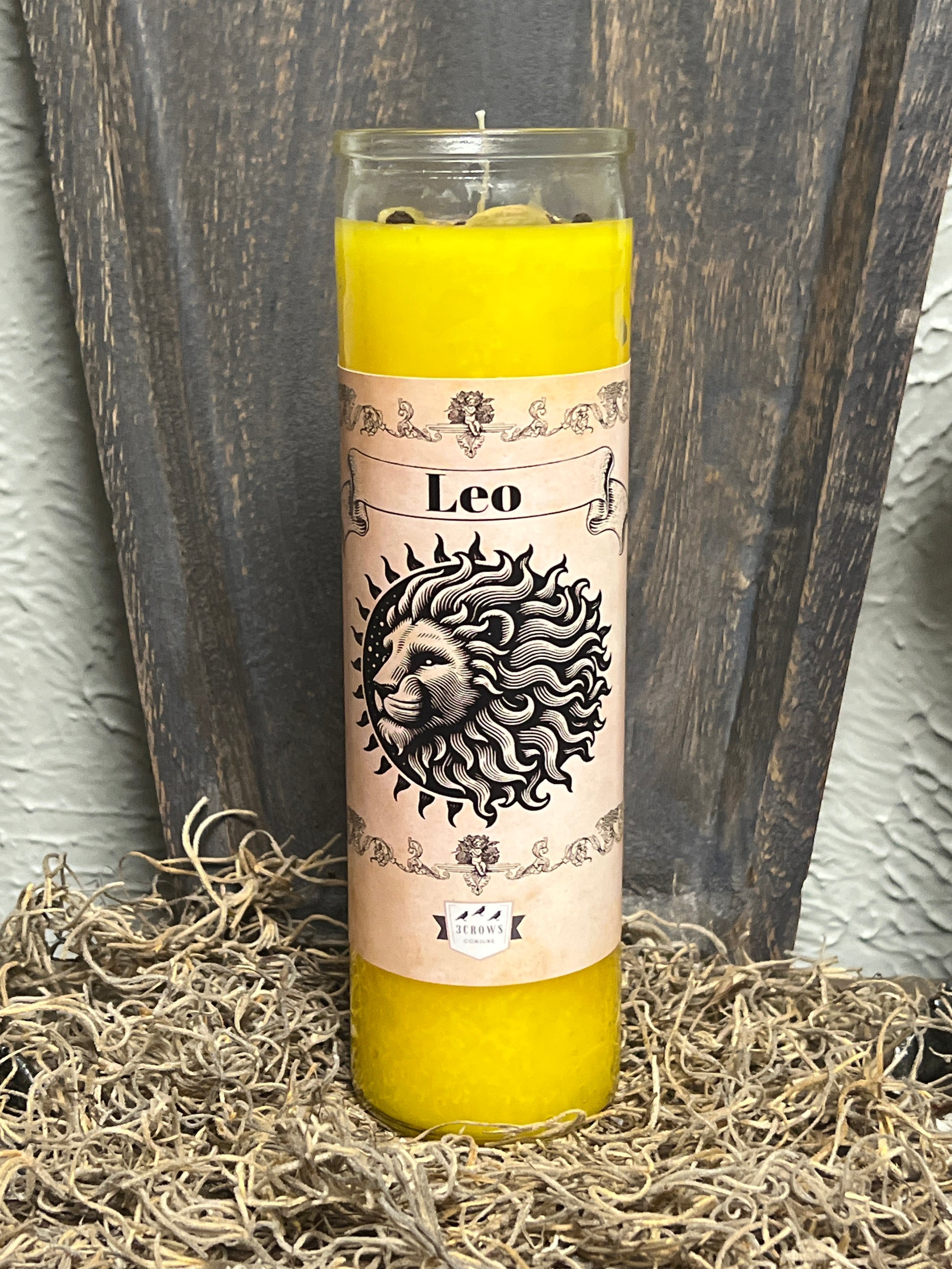 Leo 7 Day Fixed Candle is used to represent people born in this sign, used with any sort of conjuring candles whose petitions are appropriate to the astrological sign thus named, or to be burned during the months associated with those signs in order to strengthen connections to the energies represented by the signs of the zodiac. Some workers keep a "Master Candle" on their altar at all times and dress it each month with that month's appropriate zodiacal oil.