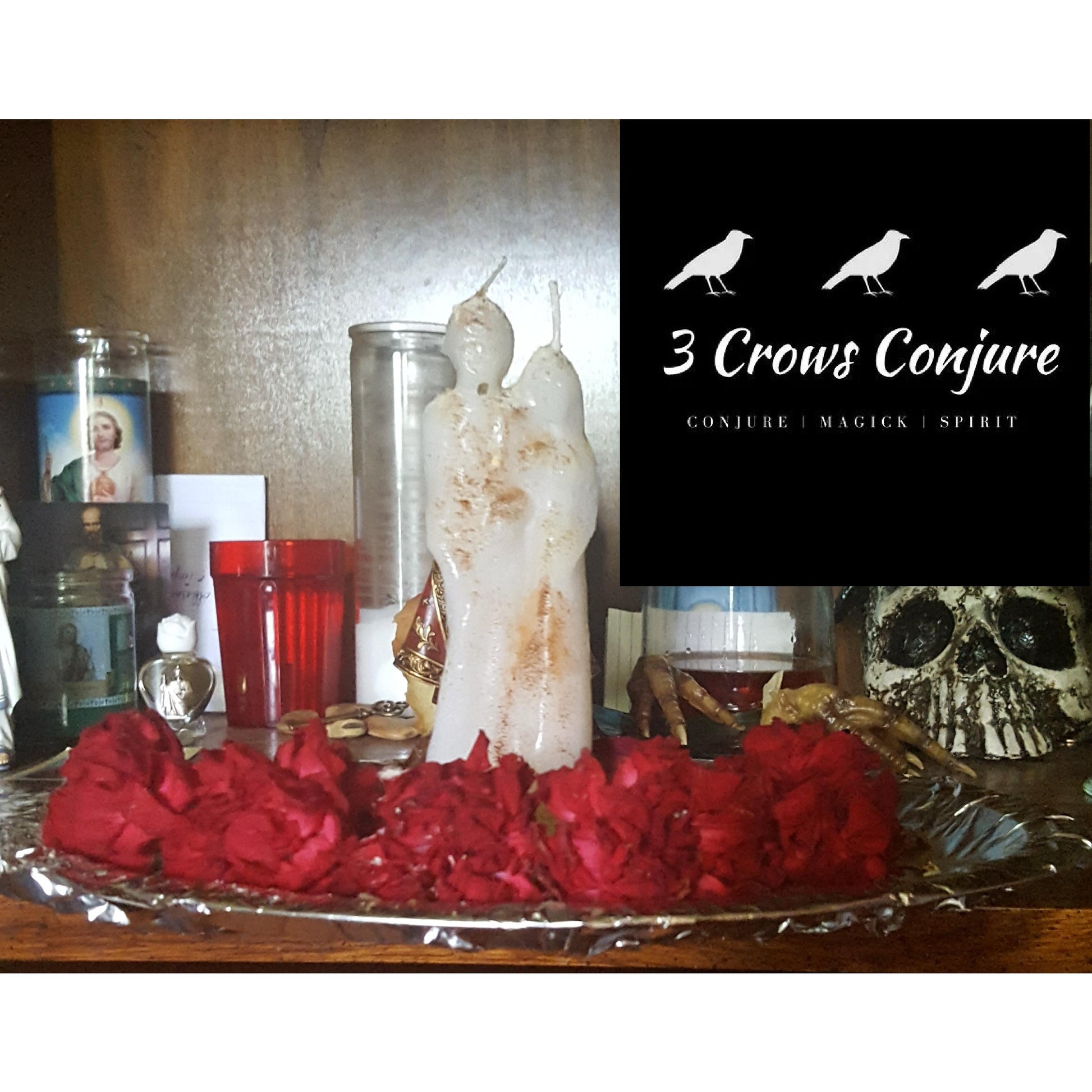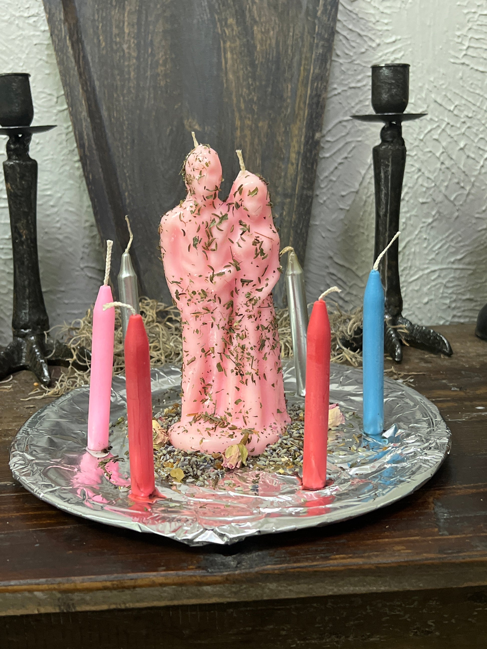We will bless a Marriage figural candle you choose, dress it with the appropriate oils and herbs, and dress and bless additional taper candles.