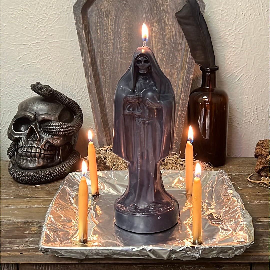 We will dress and pray over a Santa Muerte Candle for you and affix the appropriate adjoining candles for your working. When your candle working is finished we will write a report for you about the working for you and any recommendations that we suggest for your situation if any are needed.