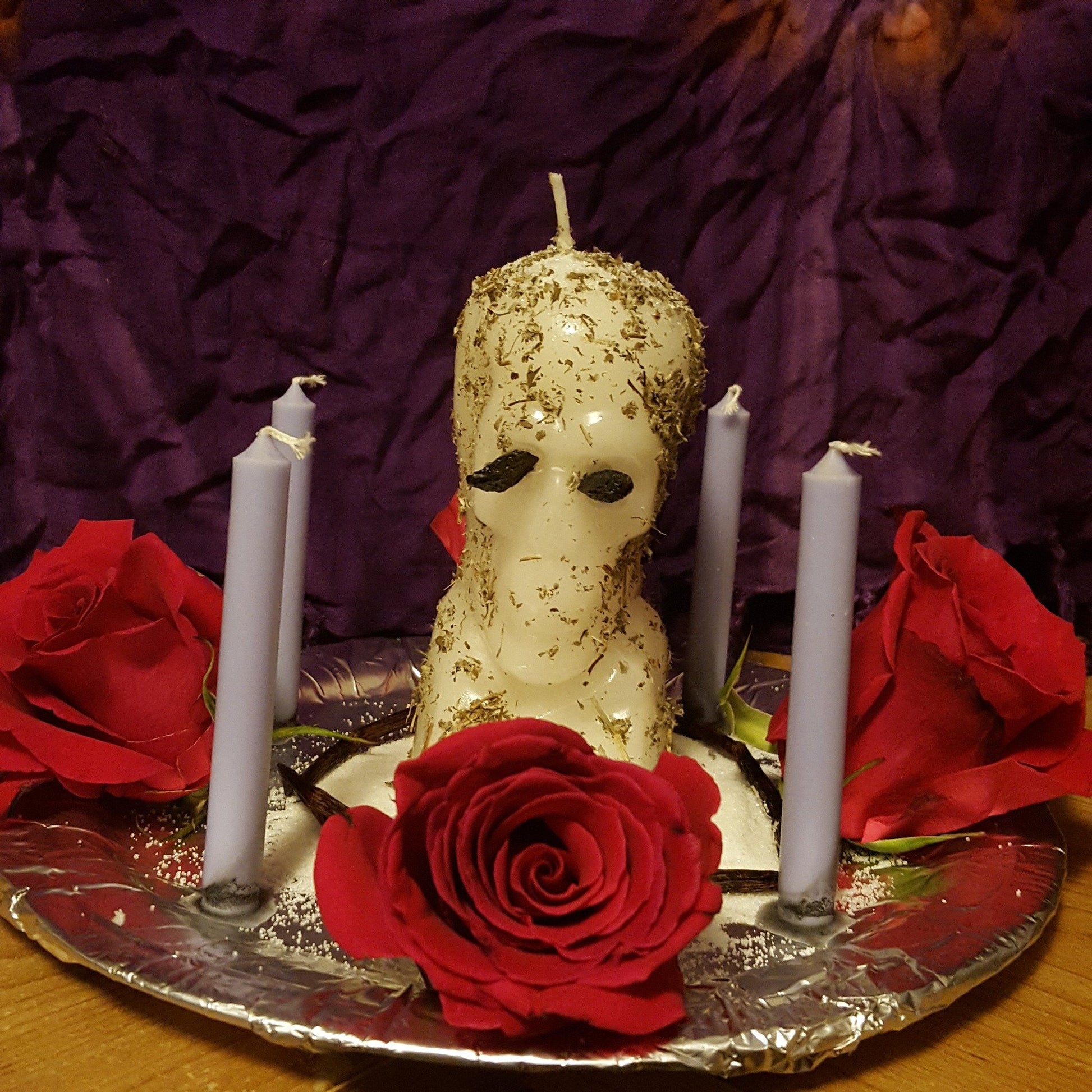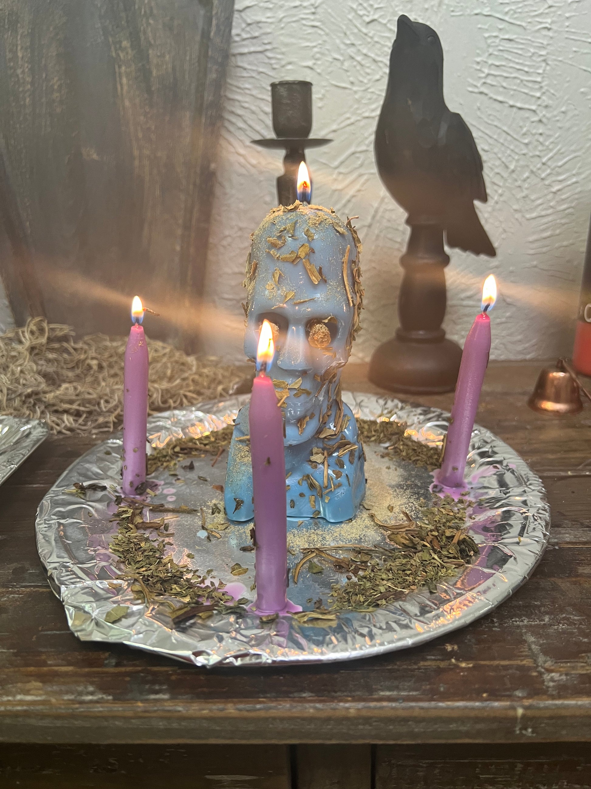 We dress a skull candle with the appropriate oils and herbs and carve your name and the name of the other person into the candle. We surround it with taper candles geared towards the type of communication you want to open: love, friendship, career, money or any other topic.