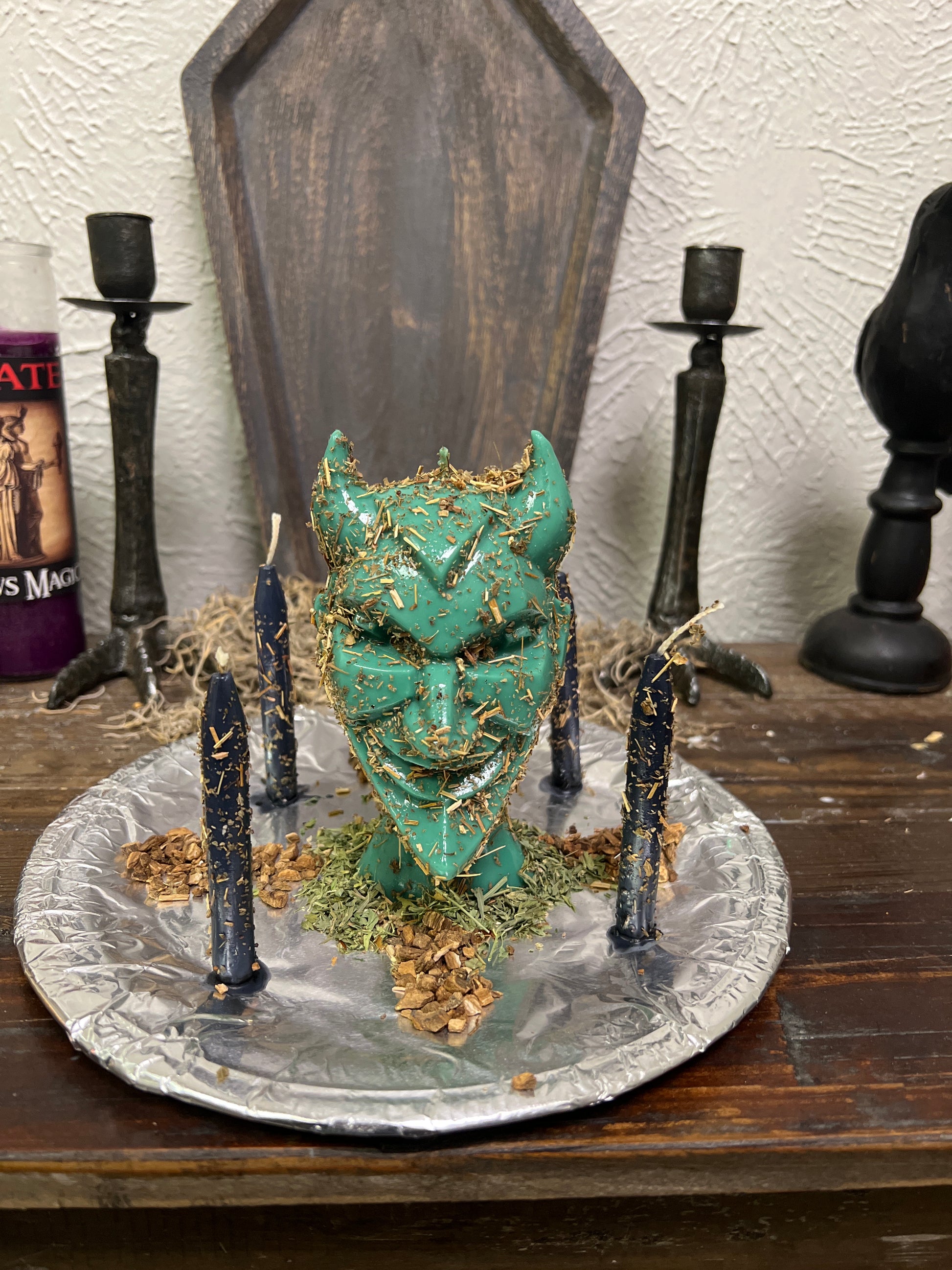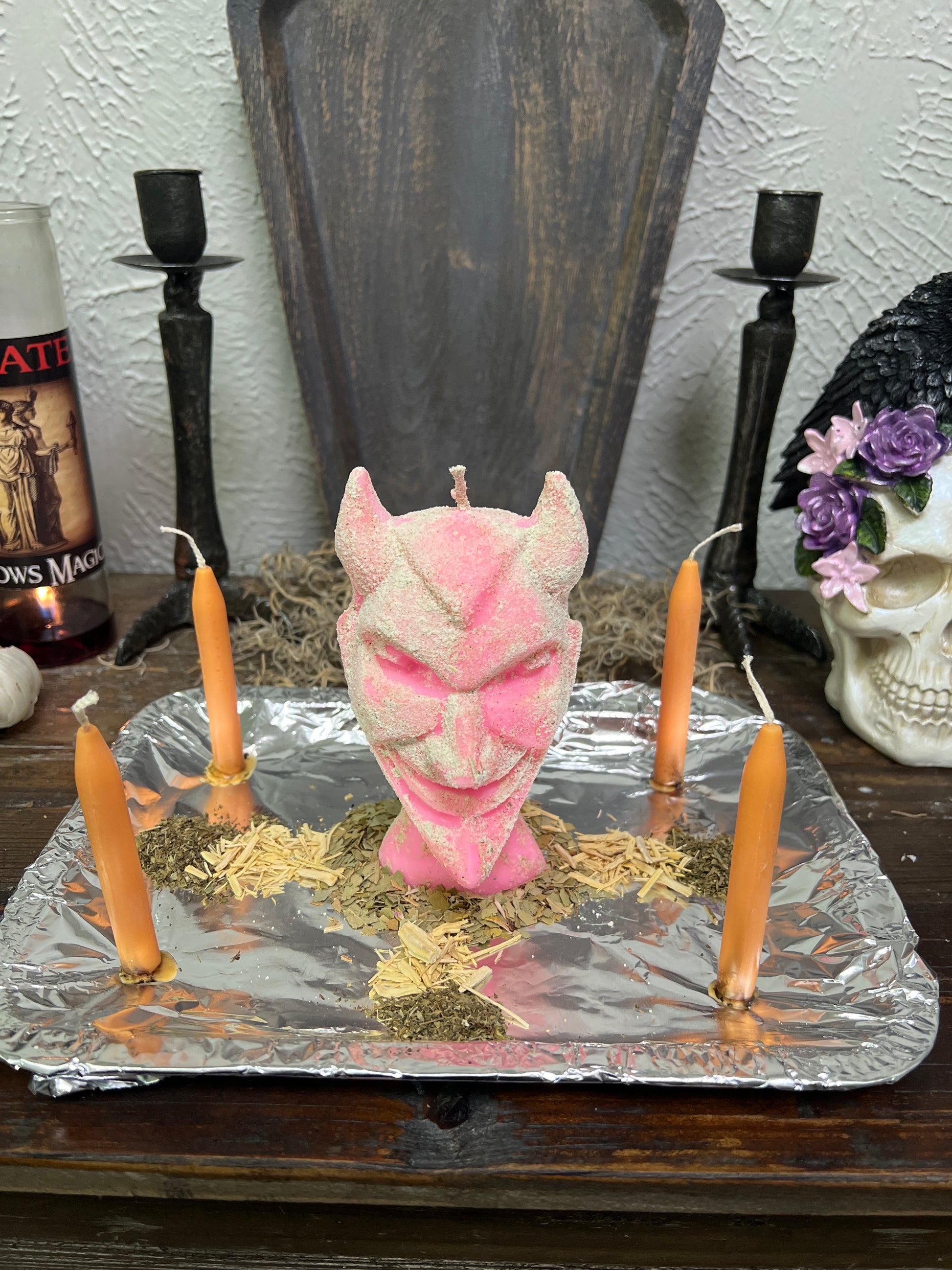 We then bless a beautiful large devil head candle, and dress it with the appropriate herbs and oils designed to bring your desired results. We then carve your name into the candle, place your intention underneath the candle, and light it while praying for what it is that you would like to attain. Each candle is custom-made to order.